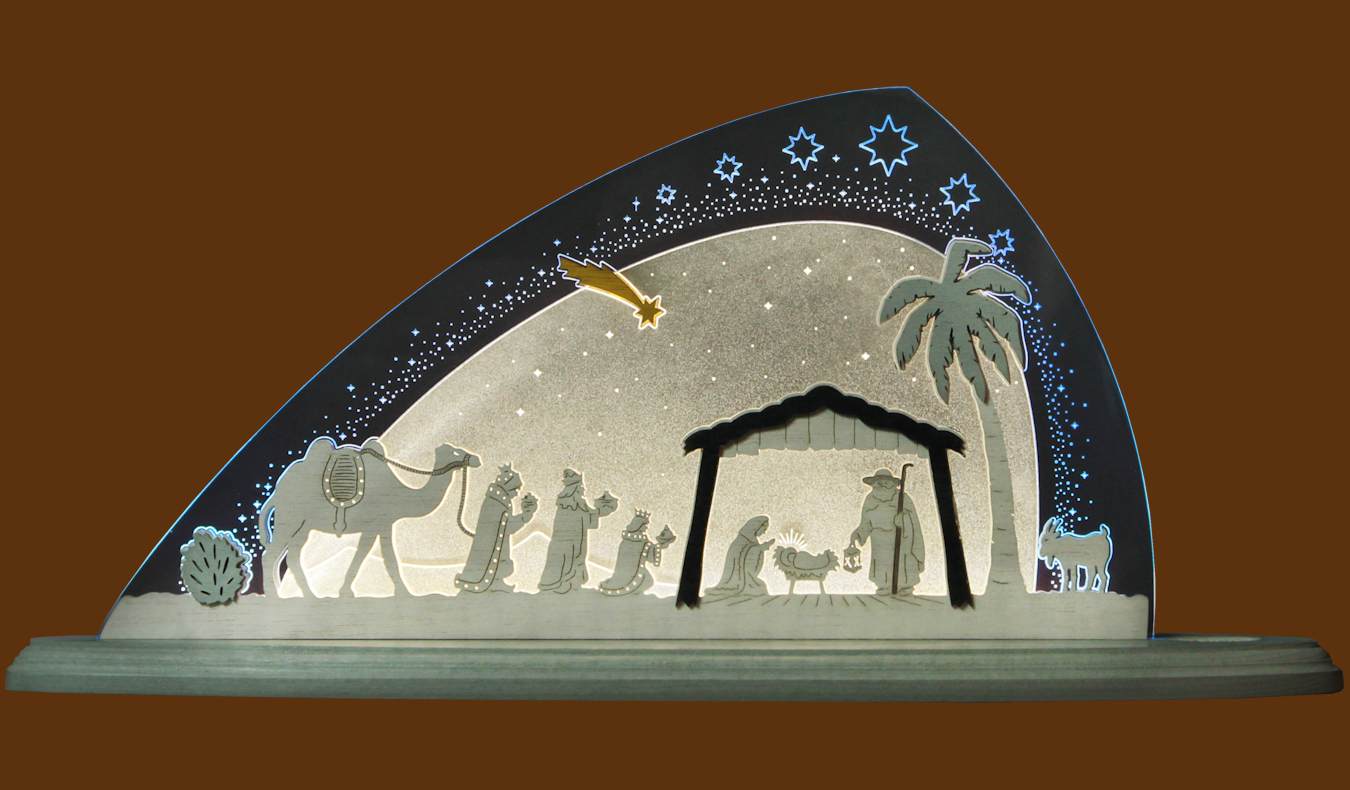 Unter einem Sternenhimmel ist die Geschichte Christi Geburt dargestellt. In einem Stall befinden sich Maria und Josef, die um eine Krippe mit dem Jesuskind stehen. Ergänzt wird die Szene durch die Heiligen drei Könige die sich, begleitet von einem Kamel, mit ihren Geschenken dem Stall nähern.Die Motivleuchte ist aus einem bläulich und weiss scheinenden Acrylglas gefertigt und zeichnet sich durch eine glänzend-glatte Oberfläche und eine hohe Transparenz aus. Für einen besonderen Lichteffekt sorgt eine Lasergravur, durch die ein leuchtender Kanteneffekt erzielt wird. Zusätzlich ist die Motivleuchte mit lasergravierten Sperrholzelementen versehen und teilweise farblich abgesetzt. Durch die Kombination dieser beiden Werkstoffe wird ein besonders schöner 3D-Effekt erzeugt. Eingearbeitet in einen farblich abgestimmten Sockel aus Eschenholz ergibt sich ein stimmiges Gesamtbild. Für die passende Beleuchtung sorgt ein im Sockel eingearbeiteter, energiesparender LED Lichtstreifen.